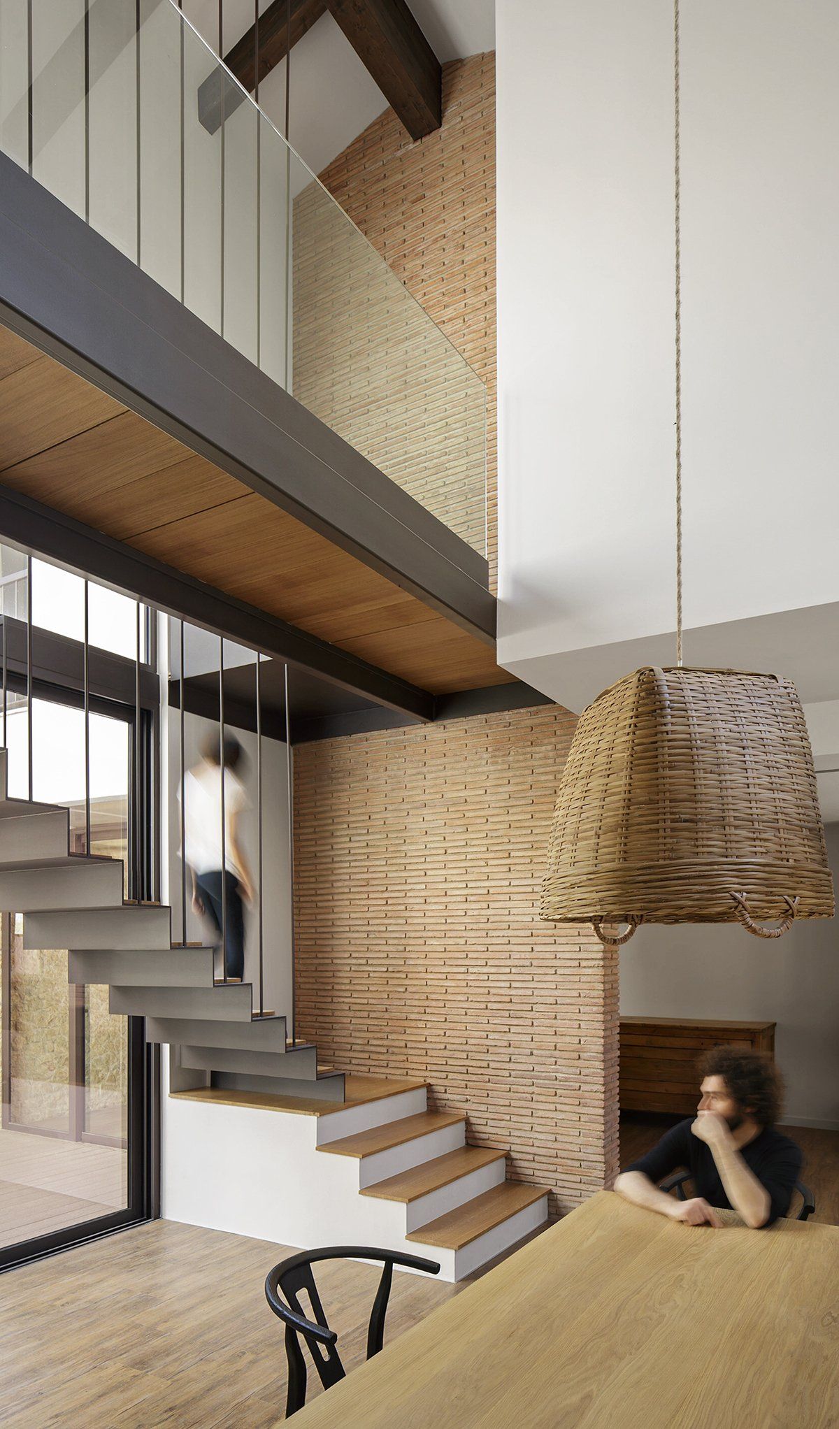 La utilització de la fusta a l’interior, - sostre, paviment i escala – dóna caliu a la casa. L’equilibri entre els materials naturals i industrials aporten qualitat i personalitat a tots els espais de l’habitatge.