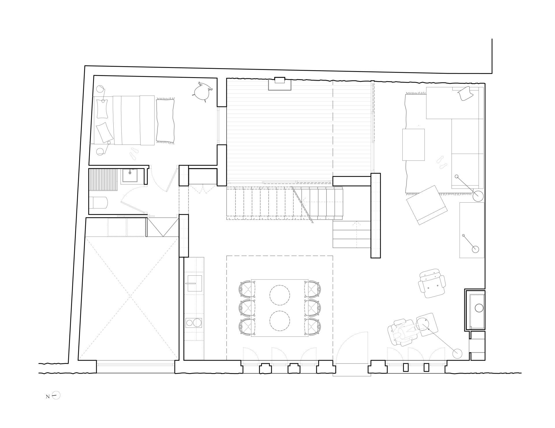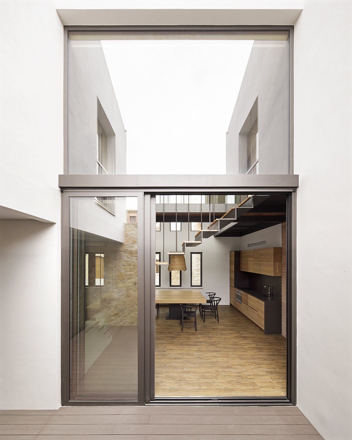 Com a rèplica interior d’aquest pati, la distribució interior gira entorn d’un espai a doble alçada de les mateixes proporcions - separat d’aquest només per una gran vidriera - i que vincula els dos nivells en que es desenvolupa la casa. La confluència dels dos espais es converteix en el nucli de la casa i permet, al mateix temps, la comunicació vertical entre els dos nivells i la connexió entre les dues bandes de la planta superior.
